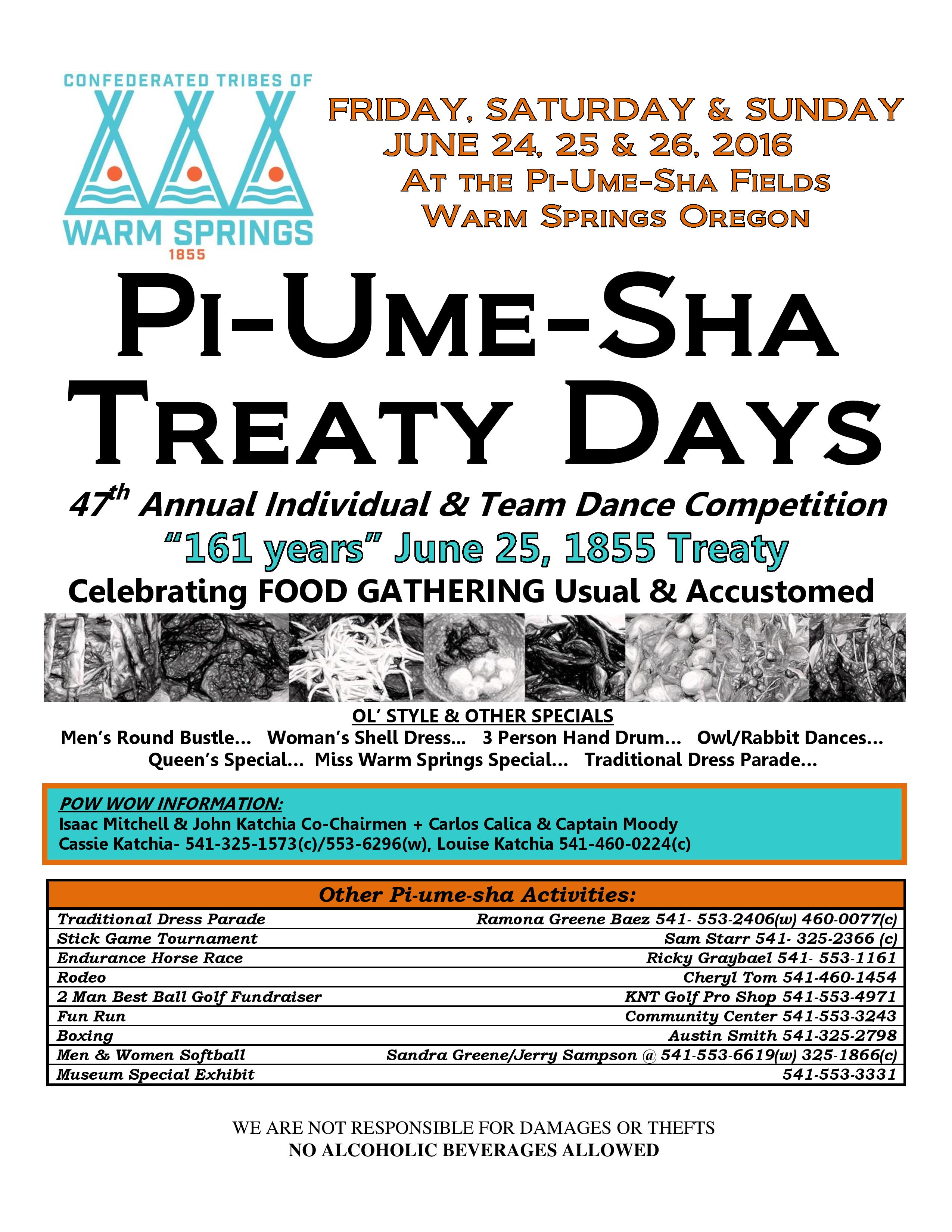 Pi-Ume-Sha Treaty Days is this weekend in Warm Springs. The event commemorates the signing of the Treaty of 1855 between the United States Government and the Indians of Middle Oregon. That Treaty established the Warm Springs Indian Reservation. To learn more about the history of treaty times you can check out KWSO’s Our People and Mother Earth with the “Old Timer.” ( https://soundcloud.com/kwso-radio/sets/our-people-mother-earth-062016-old-timer-treaty-history) For some legal perspective on the Treaty of 1855, listen to Warm Springs Program with Tribal Attorney Howie Arnett. (https://soundcloud.com/kwso-radio/sets/warm-springs-program-062016-treaty-of-1855-with-howie-arnett)