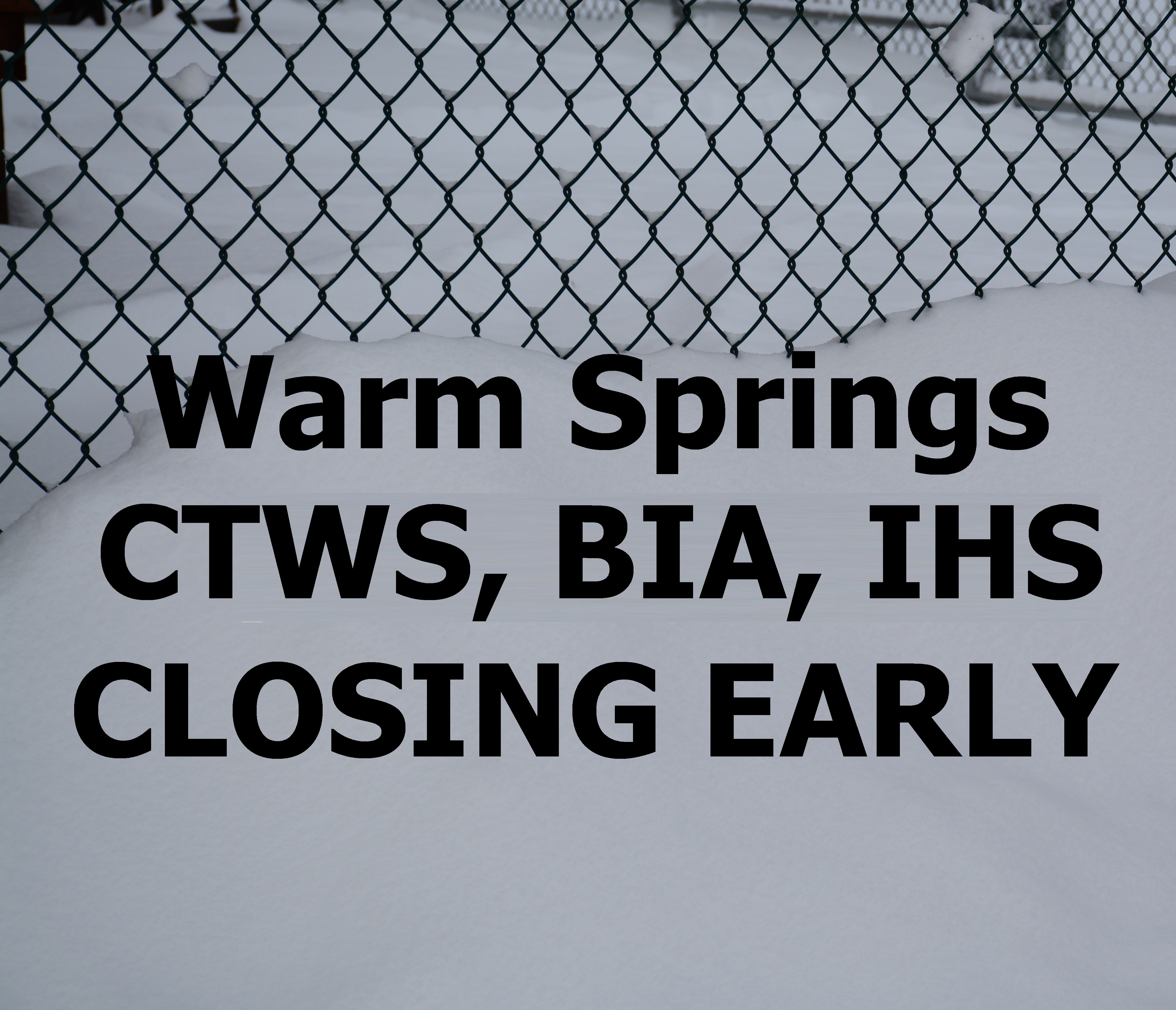 Due to the ongoing snow storm Confederated Tribes of Warm Springs Offices will close at 1pm today, Wednesday December 14, 2016. Bureau of Indian Affairs, Warm Springs Agency, will close at noon today. The Indian Health Services Clinic will also close at 1pm however – to meet patient needs they will open up medical and pharmacy from 11am – 1pm.