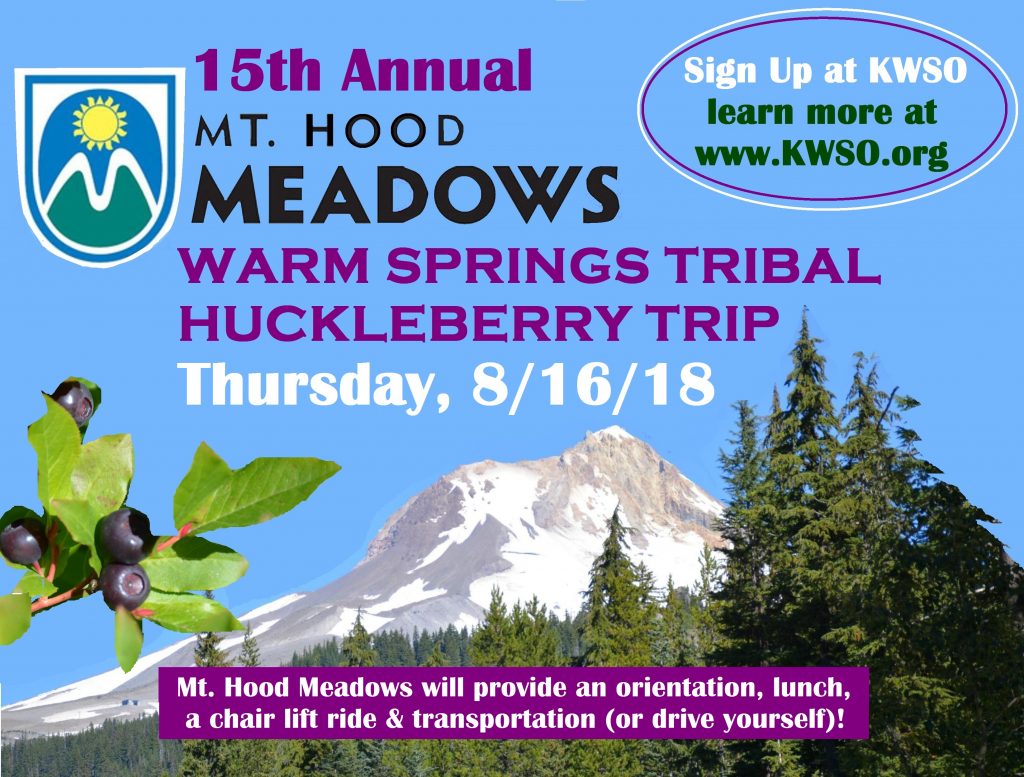 The 15th annual Warm Springs Tribal Huckleberry Picking Event hosted by Mt. Hood Meadows is scheduled for Thursday August 16th. The outing provides an opportunity to scout out and pick Huckleberries on Mt. Hood, while enjoying the hospitality of Mt. Hood Meadows staff.