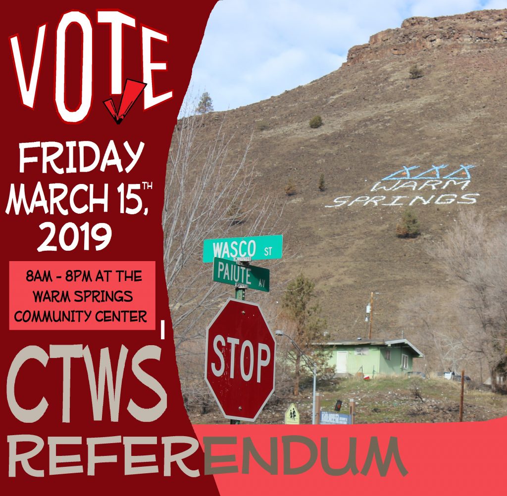 There is a Referendum Vote set for Friday March 15, 2019 for eligible Tribal Member Voters in Warm Spring. Voting will take place from 8am to 8pm on that date at the Community Center. Absentee ballots have been mailed out. Any tribal member voter who lives off of the Warm Springs Reservation and did not receive their ballot should contact the Warm Springs Vital Statistics office The referendum asks tribal voters to add the 1980 census to the list of baseline census years for determining the Confederated Tribes blood quantum.