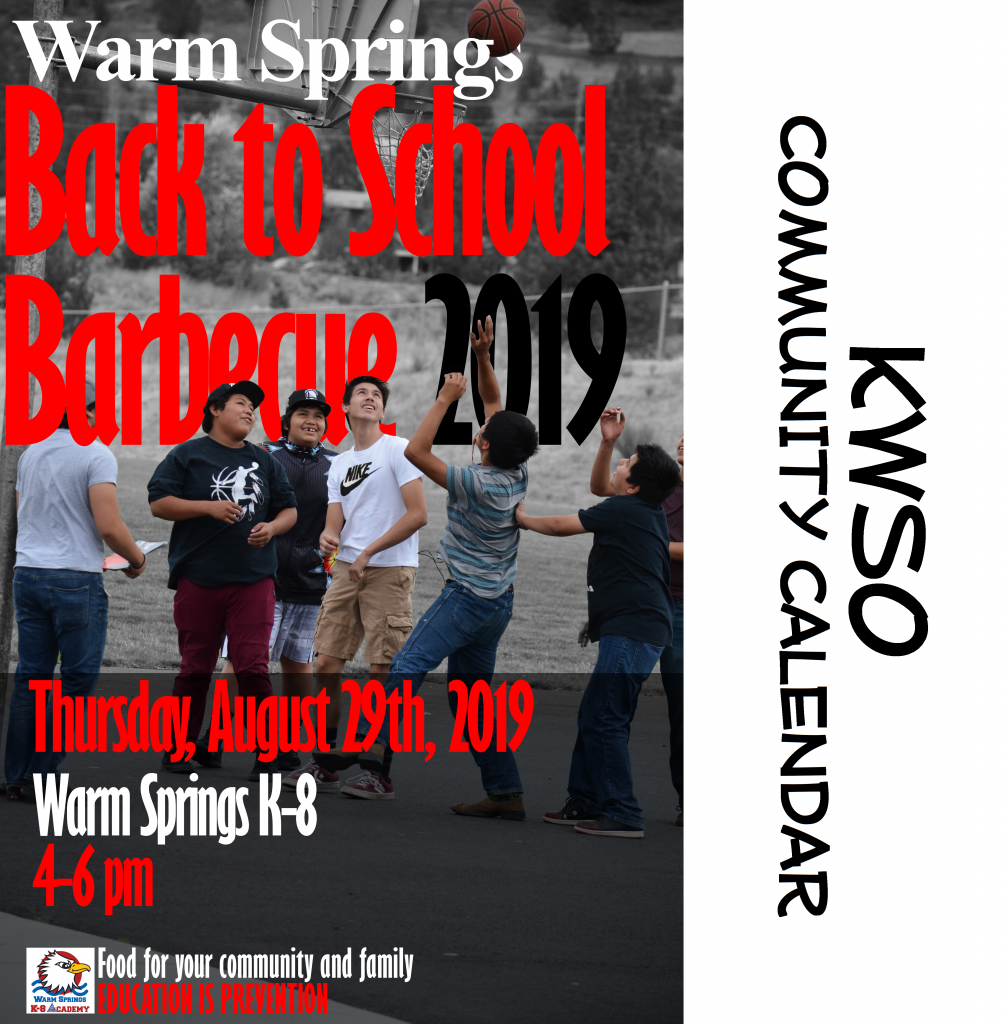 - The Warm Springs Back to School Barbecue is today from 4-6pm at the Warm Springs K thru 8 Academy. Hot Dogs and Hamburgers are on the menu and everyone is welcome. There will also be a family information and resource fair in the commons. Check out the information and pick up a new back pack – and stop by the KWSO booth for a Native Student T-shirt!