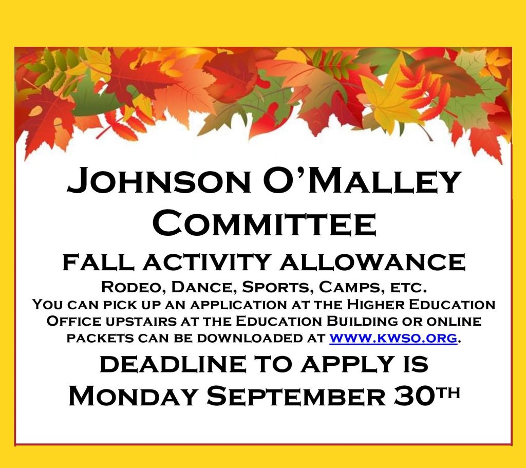 The Johnson O’Malley Committee for Warm Springs Families is now accepting Applications for the fall activity allowance. This can be for activities such as Rodeo, Dance, Sports, Camps, etc. You can pick up an application at the Higher Education Office upstairs at the Education Building or online packets can be downloaded here: JOM Fall 2019 packet