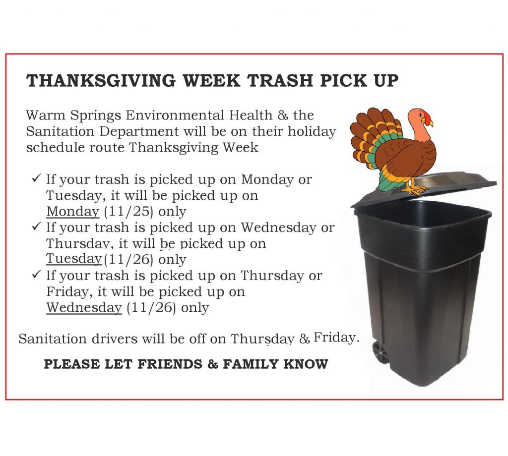 WARM SPRINGS SANITATION REMINDS THE COMMUNITY ABOUT TRASH PICK UP THE WEEK OF 11/25/19