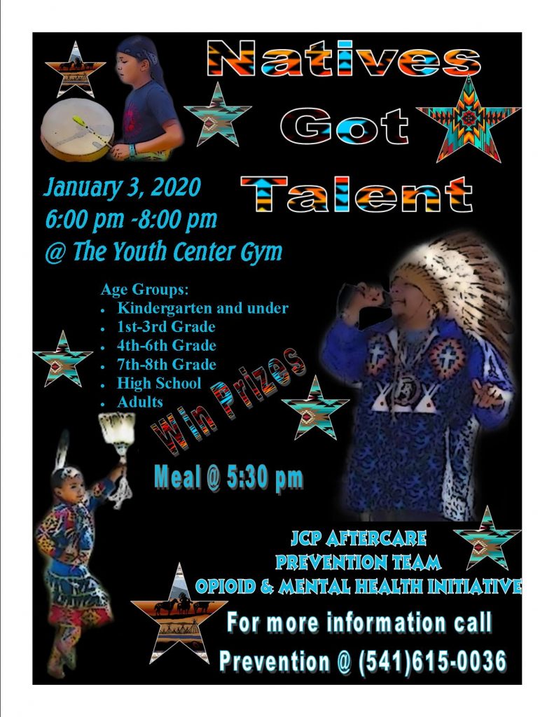 Event Flyers010320 Natives Got Talent Posted on December 12, 2019October 7, 2025 by gilbert.brunoe@wstribes.org 12 Dec For a copy of the flyer…click 010320 Natives Got Talent gilbert.brunoe@wstribes.org 121919 Elder Christmas Lunch Calendar for Fri. Dec. 13, 2019