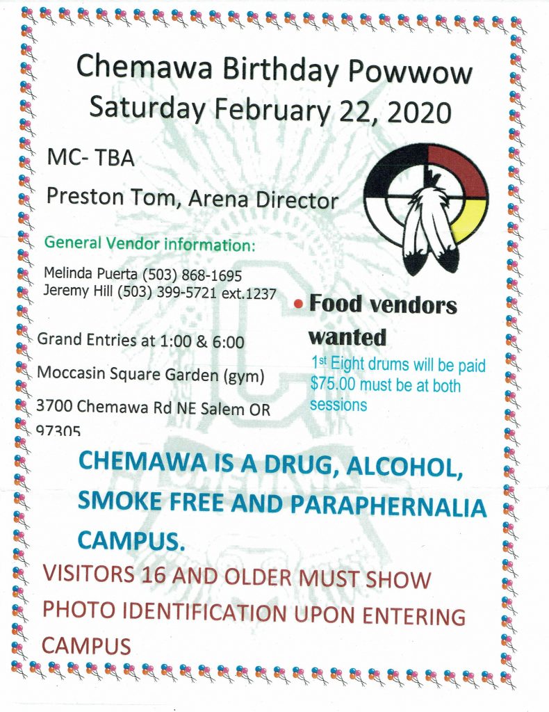Event Flyers022220 Chemawa Birthday Powwow Posted on February 21, 2020October 7, 2025 by gilbert.brunoe@wstribes.org 21 Feb For a copy of the Flyer…click 022220 Chemawa Birthday Powwow gilbert.brunoe@wstribes.org Calendar for Sat., Feb. 22, 2020 022220 Yoga Class