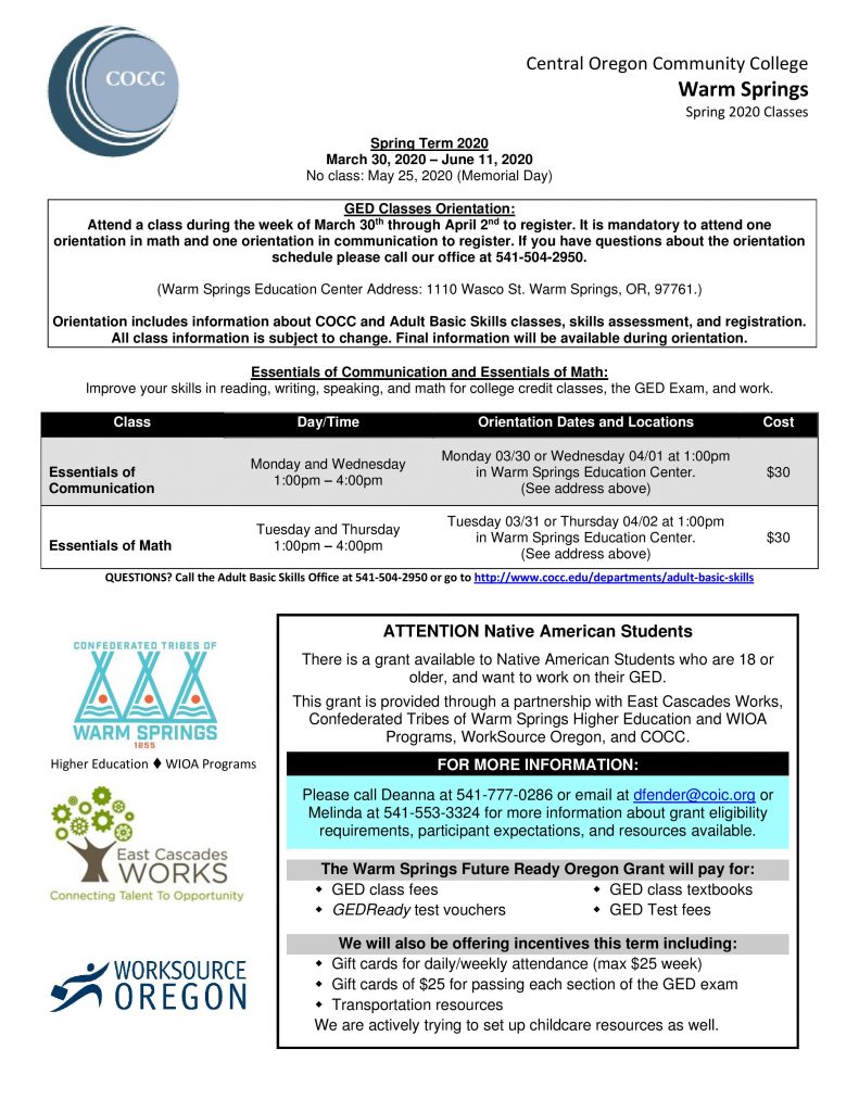 Event Flyers033020 Spring Term GED Classes 2020 Posted on February 12, 2020October 7, 2025 by gilbert.brunoe@wstribes.org 12 Feb For a copy of the flyer…click HERE gilbert.brunoe@wstribes.org 021220 JCP Youth Activities to June 2020 Calendar for Thu. Feb. 13, 2020