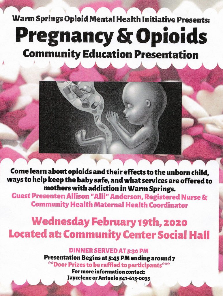 A community presentation on Pregnancy and Opiods is set for Wednesday, Feb. 20th at the Community Center Social Hall. Dinner at 5:30 witht he presentation at 5:45. Door Prizes! This ia a presentation of the Warm Springs Opioid Mental Health Initiative. You can download a flyer HERE