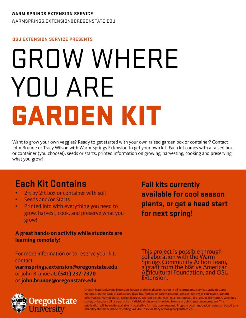 OSU Extension is providing folks with Garden Kits. These kits come with a 2-feet by 2-feet raised box, seeds, starts and information about the gardening process. Contact John Brunoe at OSU Extension to reserve your kit or more information. See PDF flyer here.