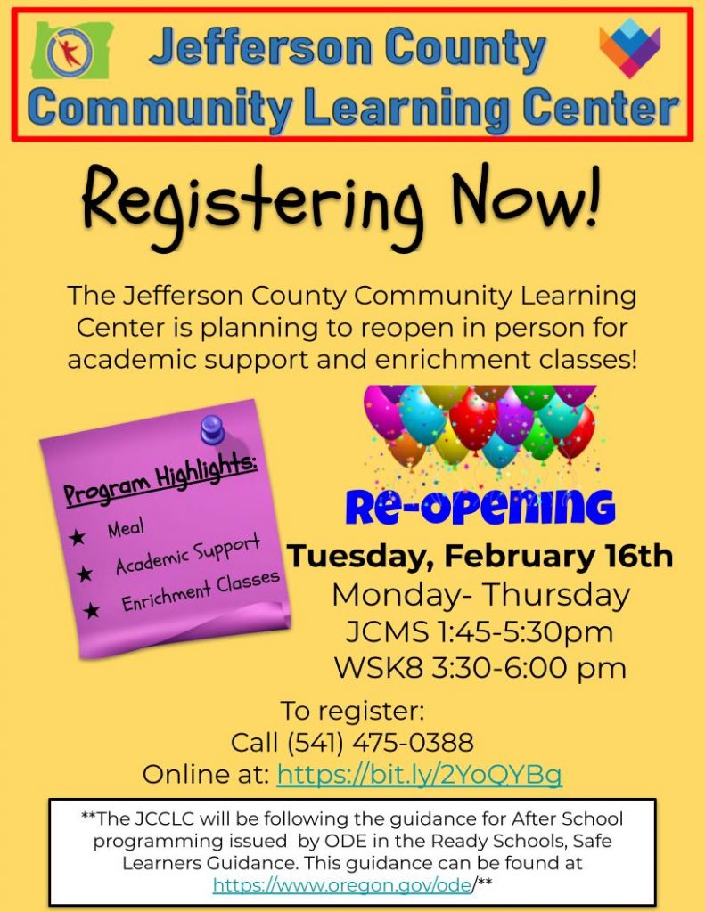 The Jefferson County Community Learning Center again open for afterschool in-person academic support and enrichment classes. You can learn more about what is availalbe and how to sign up by calling 541-475-0388.