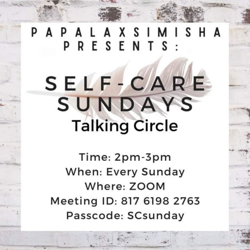 Papalaxsimisha presents Self Care Sundays – a virtual Talking Circle every Sunday afternoon from 2-3 on ZOOM.