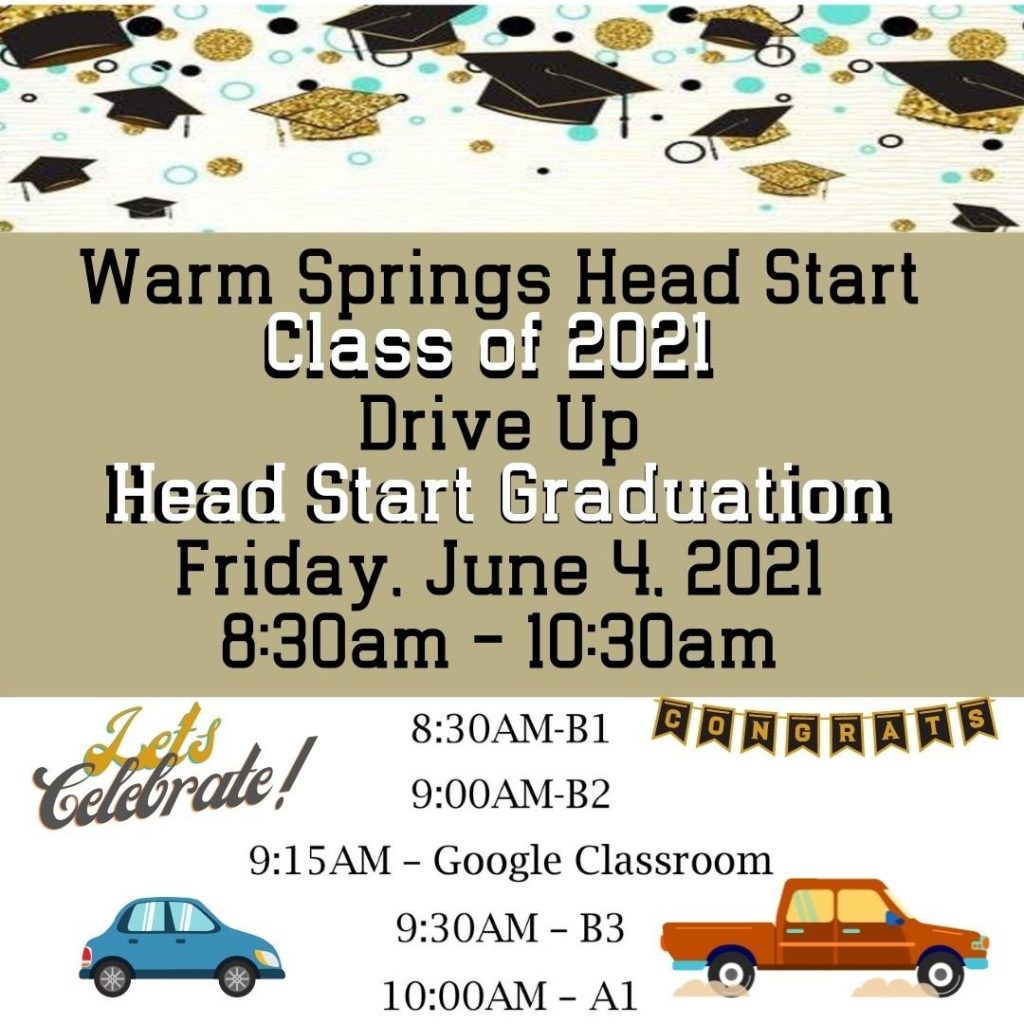 The Warm Springs Head start graduation will be Friday June, 4th. The graduation will recognize students by classroom starting at 8:30 with classroom B1, followed by B2 at 9am, 9:15 will be google classroom, B3 at 9:30, and A1 at 10am. There rules that must be followed by families and those participating in the drive-up.