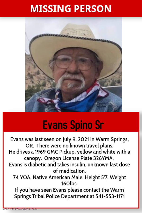 Warm Springs Tribal Police are asking for the community’s help in locating 74-year-old Evans Spino Sr. His family reported that he was last seen in Warm Springs on Friday, July 9th. His vehicle is a 1969 yellow and white GMC truck, license plate 326YMA. Anyone with information is asked to contact tribal police 541-553-1171.
