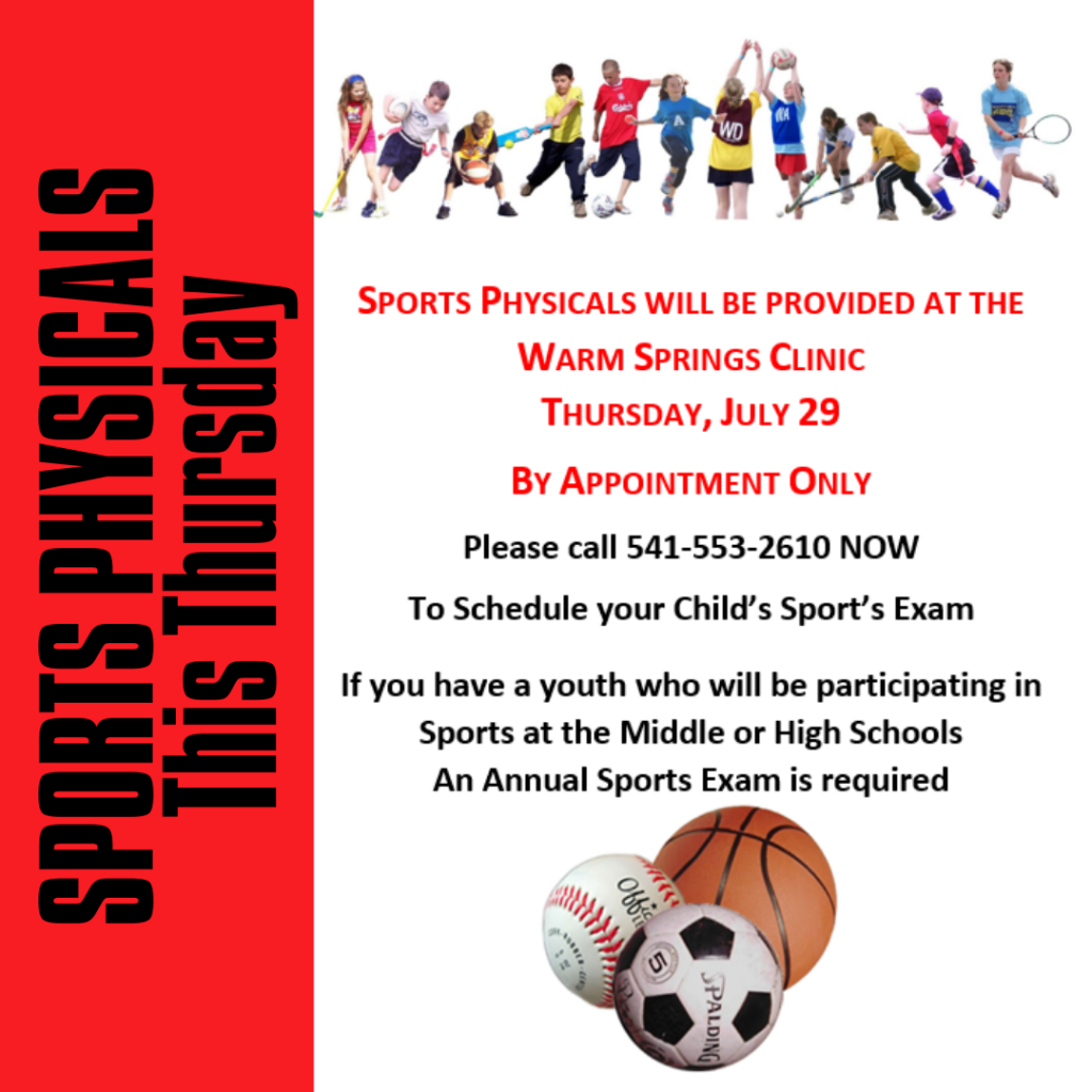 The Warm Springs Health and Wellness Center is providing sports physicals starting Thursday July, 29th. If you have youth who will be participating in sports at the middle or high school, an annual sports exam is required. Appointments are required. For questions to schedule your child’s sport’s exam call, 541-553-2610.
