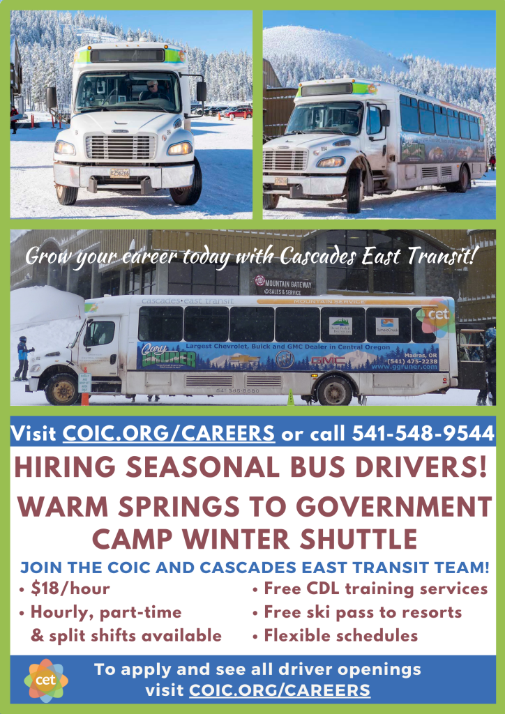 Cascades East Transit is seeking a bus driver for a shuttle bus between Warm Springs and Mt Hood this winter.