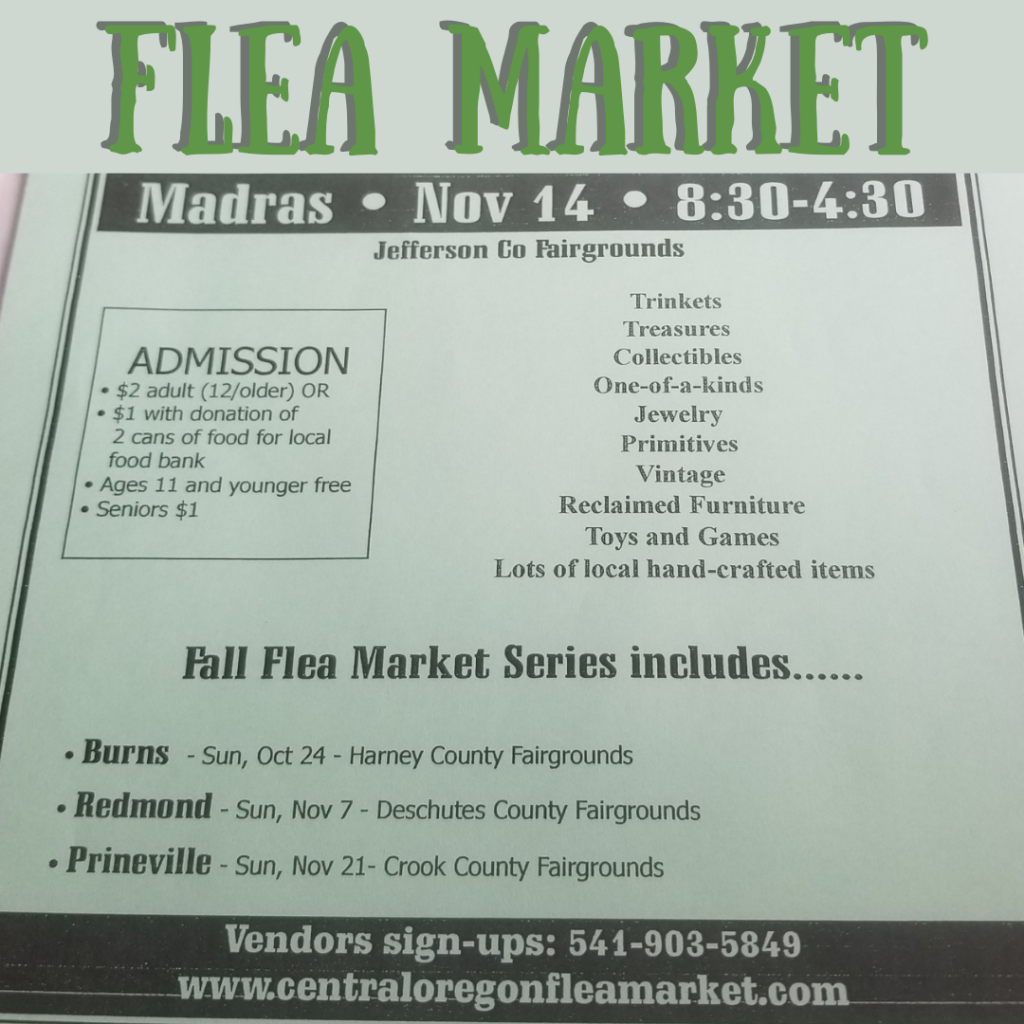 There are 4 tables left to set up. If you are an interested vendor – call 541-903-5849. You can learn more at central Oregon flea market dot com. They will also be set up at the Crook County Fairgrounds on November 21st.