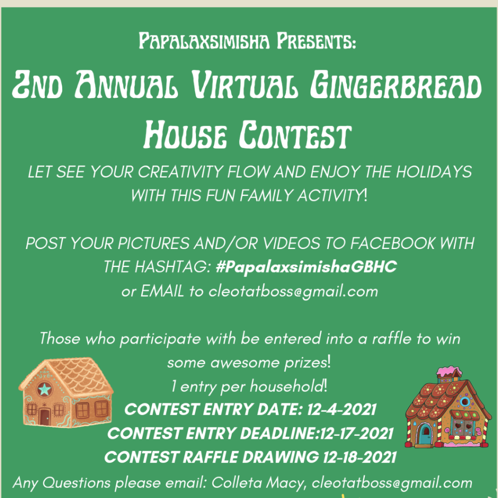 The 2nd annual Papalaxsimisha Virtual Gingerbread House Contest will be accepting pictures of your Gingerbread House from December 4th until the 17th.