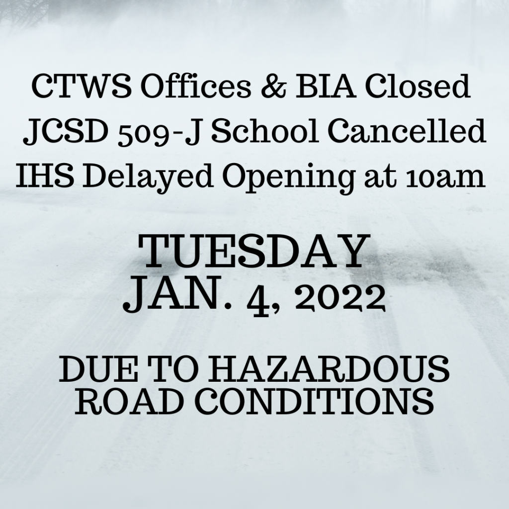 Due to hazardous road conditions, Confederated Tribes of Warm Springs Offices will remain closed today, Tuesday, January 4, 2022. Warm Springs Bureau of Indian Affairs offices will also remain closed.