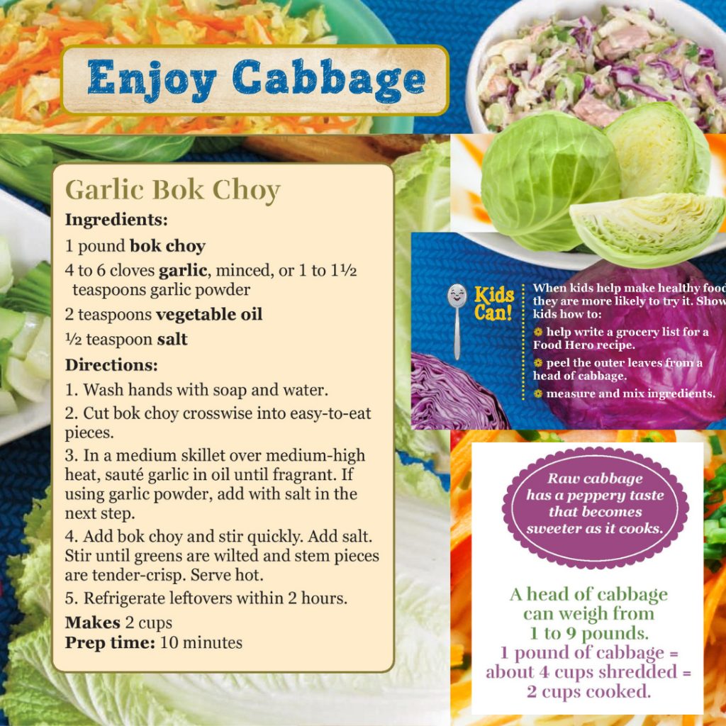 Choose cabbage with leaves that are firm and not wilted. Avoid cabbage with outer leaves or stems that are soft, yellow of brown. You can get all the Cabbage Basics by checking out THIS FOOD HERO ARTICLE.