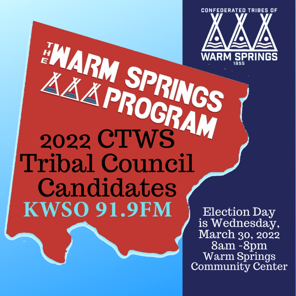 Programs2022 CTWS Tribal Council Candidates Posted on March 5, 2022 by sue.matters 05 Mar KWSO Radio · CTWS 2022 Tribal Council Candidates – KWSO Warm Springs Program Podcast sue.matters KWSO Calendar for Sat., Mar. 5, 2022 KWSO Calendar for Sun., Mar. 6, 2022