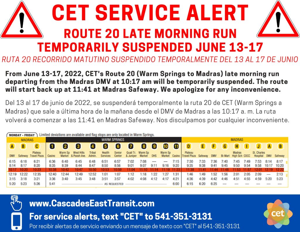 Cascades East Transit Saturday service returns this weekend for Route 20 serving Warm Springs.
