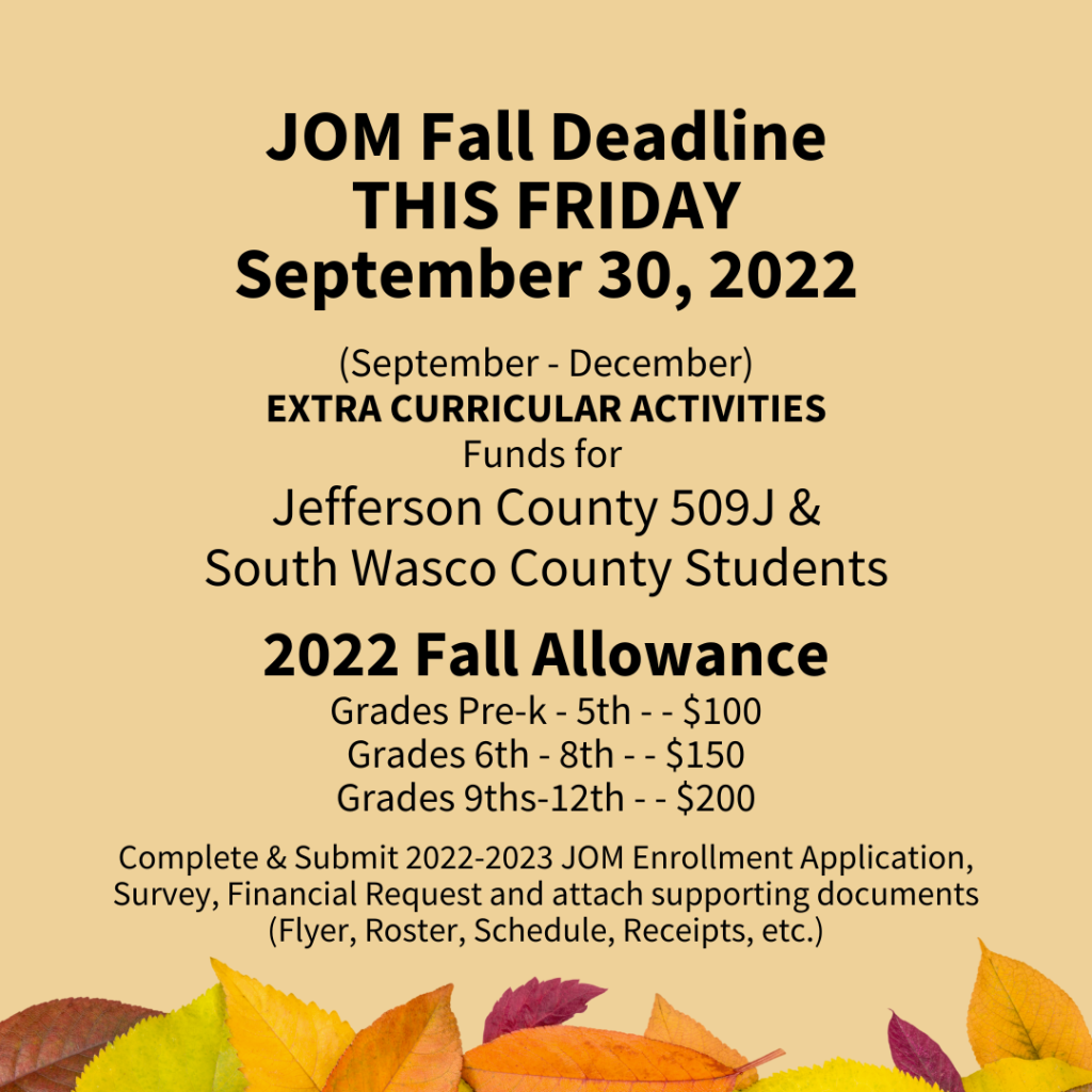 Applications for the Johnson O’Malley Committee’s fall allowance for extra-curricular activities for 509-J and South Wasco County students are being accepted until this Friday September 30th.