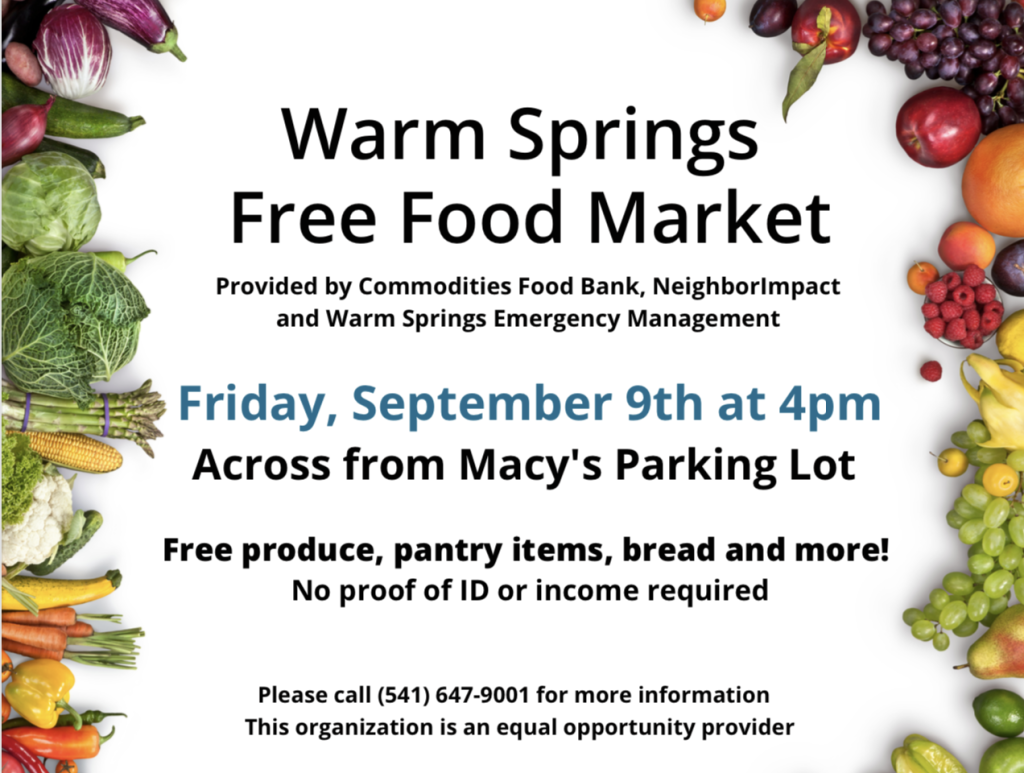 The giveaway is brought to you by the Warm Springs Commodities Food Bank, NeighborImpact and Warm Springs Emergency Management.
