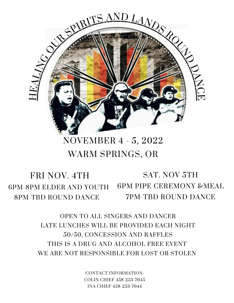 The Healing Our Spirits and Lands Round Dance will be held November 4th and 5th at the old Warm Springs Elementary School Gym.