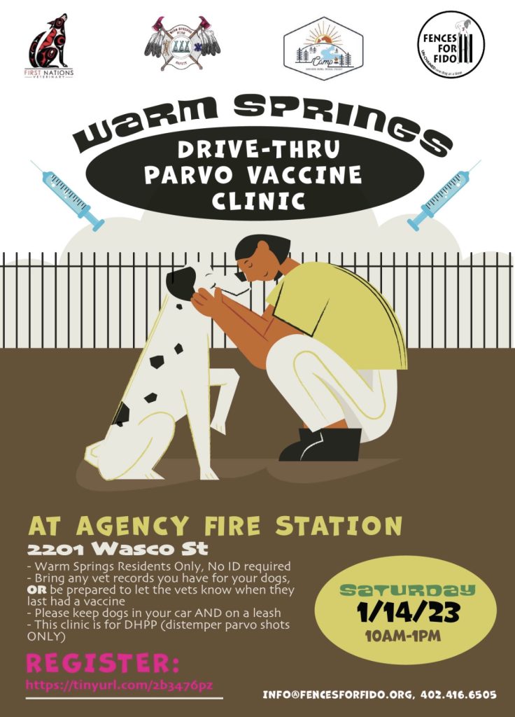 Fences for Fido is doing a free parvo vaccine clinic for dogs in Warm Springs on Saturday, January 14th from 10am to 1pm at the Agency Fire Station.