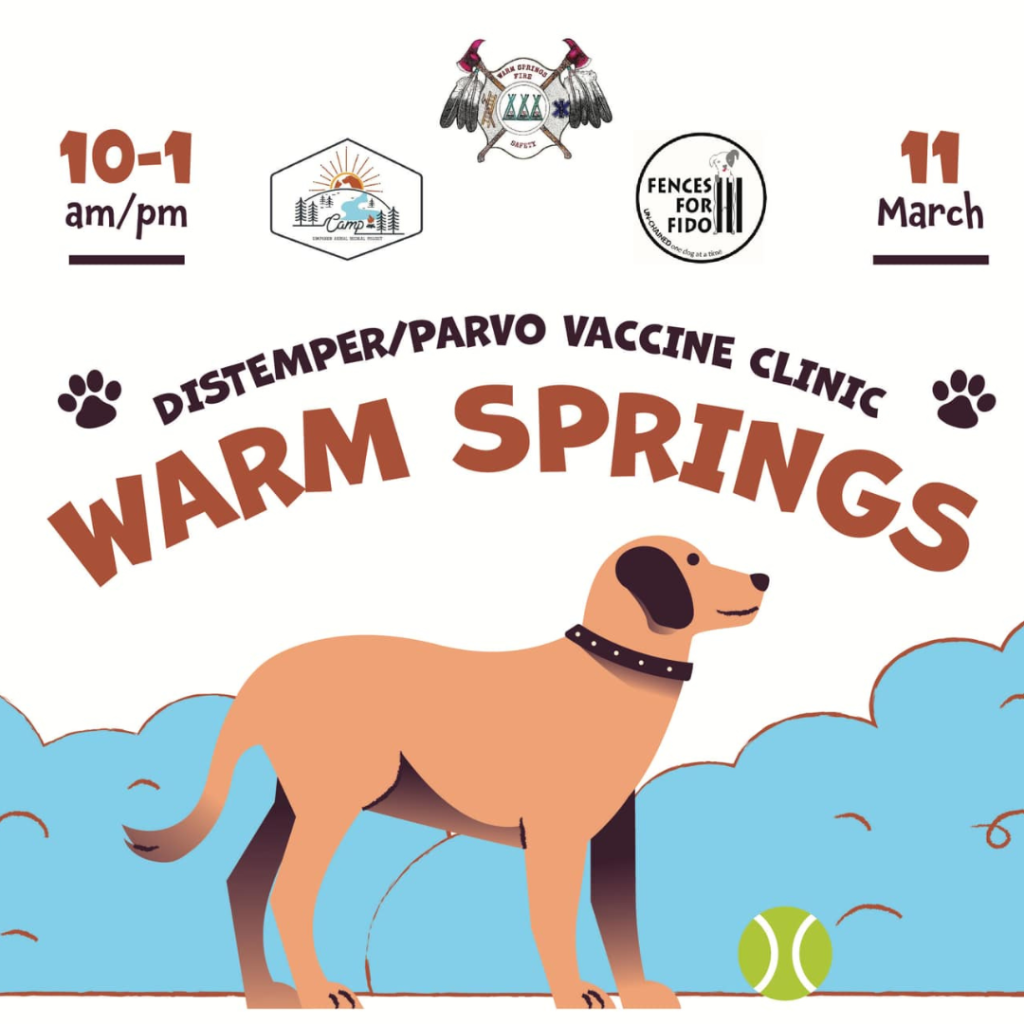 Fences for Fido is coordinating with and the Humane Society Companion Animal Medical Projectare coordinating the last of the 3-part series of distemper/parvo vaccines for Warm Springs dogs will take place on Saturday, March 11 from 10am-1pm at Fire & Safety, on Campus