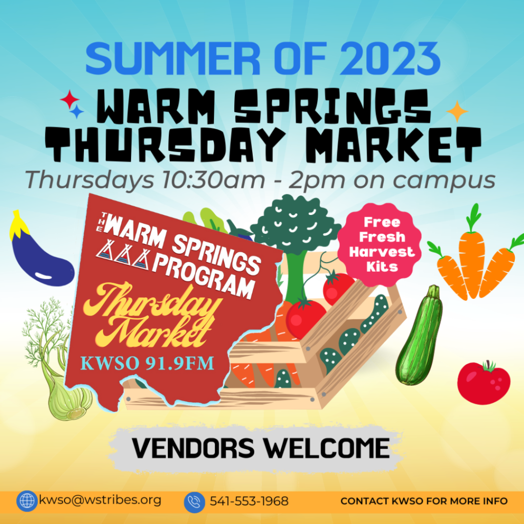 ProgramsWarm Springs Thursday Market Posted on July 28, 2023 by sue.matters 28 Jul KWSO Radio · Thursday Market – KWSO Warm Springs Program Podcast sue.matters Pastor Rick Ribeiro Linda Meanus “My Name is LaMoosh”