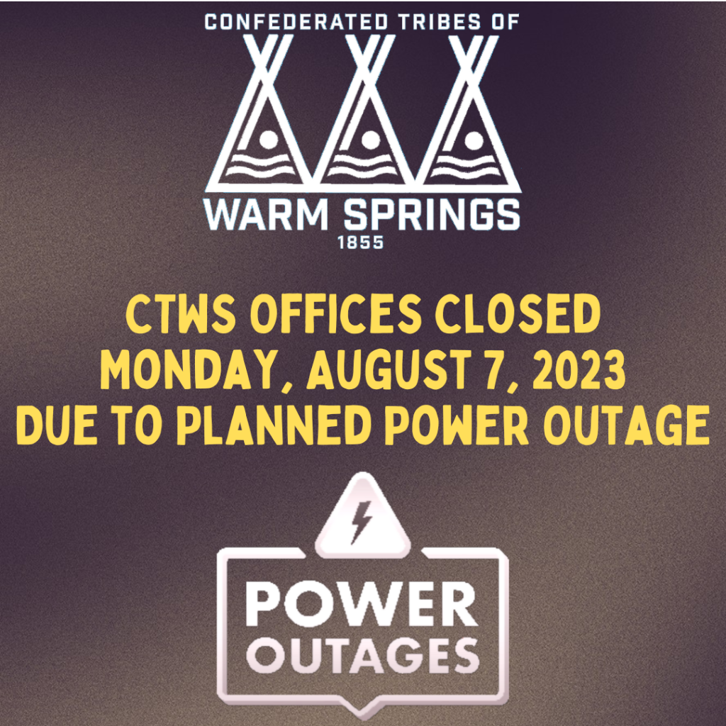Confederated Tribes of Warm Springs Offices will be closed on Monday (Aug. 7, 2023) due to scheduled power outages throughout the day.