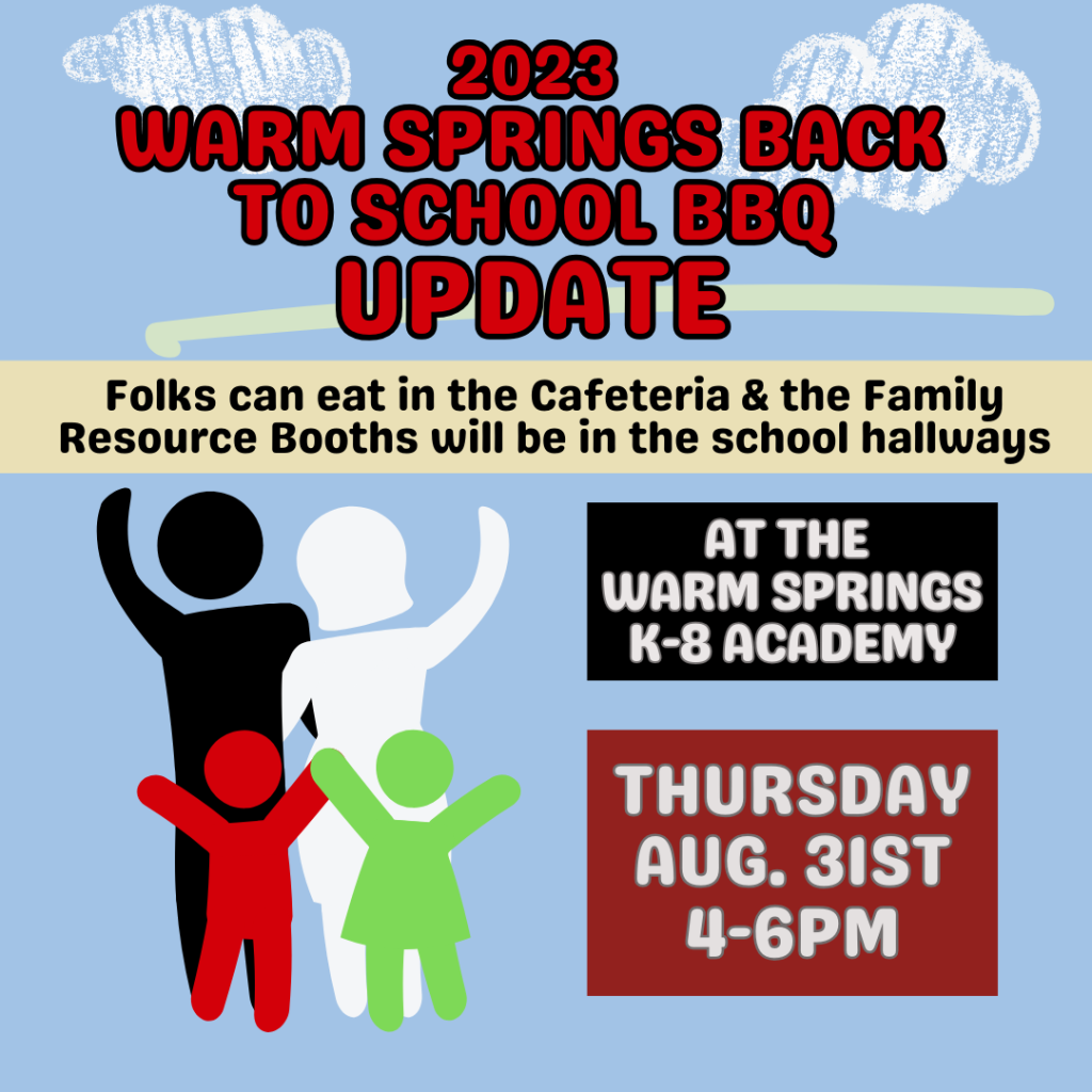 The Warm Springs Back to School BBQ is at the Warm Springs K8 Academy today from 4-6pm.