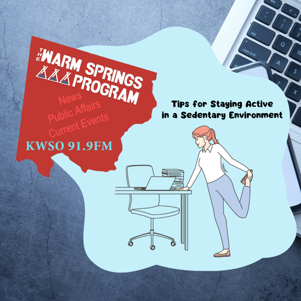 ProgramsTips to Help with Sedentary Environments Posted on August 6, 2023 by sue.matters 06 Aug KWSO Radio · Staying Active In Sedentary Environments – KWSO Warm Springs Program Podcast sue.matters KWSO Archive Huckleberry Stories Veterans Benefits Info with Mike Williams