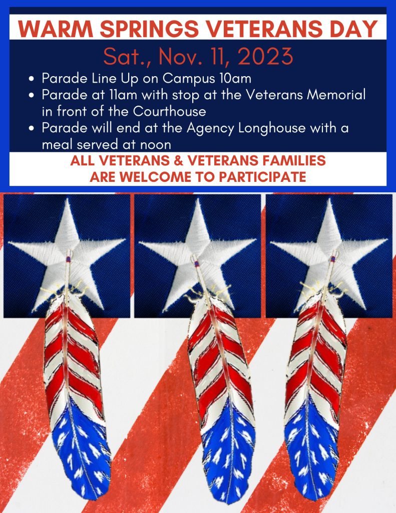 Plans are in the works for celebrating Veterans Day here in Warm Springs. This year there will be a Veterans’ Appreciation Dinner at the Simnasho Longhouse on Thursday, Nov. 9, 2023, at 5pm.