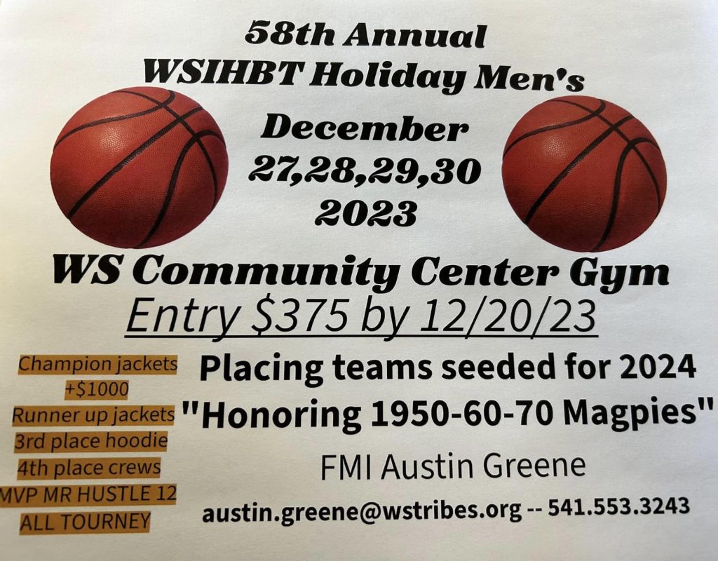 The 58th Annual Warm Springs Indian Men’s Holiday Basketball Tournament will run Thursday, December 28th – through Saturday, December 30th at the Warm Springs Community Center Gym